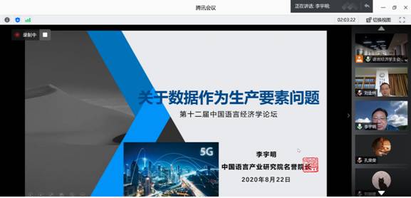 中国语言产业研究院名誉院长、北京语言大学原党委书记李宇明教授作了题为《关于数据作为生产要素的问题》的报告,强调了语言数据在语言保护、语言教育和语言信息化领域的关键性作用以及语言数据与新基建、数字经济的紧密联系。教育部语言研究所所长、《语言文字应用》主编刘朋建研究员从多角度深刻分析了新时代语言文字事业发展的形势,深刻分析了新时代语言文字事业发展的核心任务、战略任务、时代课题与重要保障。WilliamHill威廉希尔语言经济研究中心主任张卫国教授聚焦语言与健康治理这一语言生活研究的新议题,认为在此议题下个体层面的语言能力与健康的关系、国家层面的语言规划与健康治理互动的问题值得下一步深度挖掘。首都师范大学语言产业研究院院长、《语言产业研究》主编李艳教授着重对新一轮经济变革中中国语言产业连接传统与现代的重要历史功能与使命、语言技术赋能新经济与新业态的表现形式以及协同共建语言产业交叉学科具体方向的未来展望做了系统分享。广西民族大学社科处处长刘金林教授从人力资本视角探究了少数民族地区推普助力脱贫攻坚问题,认为语言具备作为人力资本的四大特征,提出最大普通话效应机能理论并实证研究了中国边境地区普通话的异质性劳动收入效应。WilliamHill威廉希尔苏剑副教授进行了题目为《国家发展战略中的语言占位与语言经济》的报告,从一带一路与语言红利等七个维度对语言占位和语言经济发展新动向、新需求、新热点进行了详细剖析和解读。