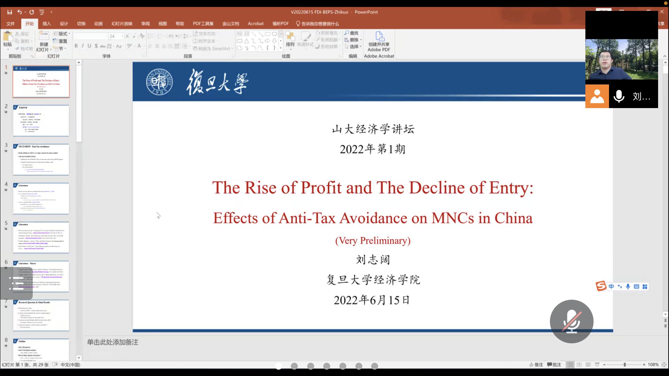 2022年6月15日下午,WilliamHill威廉希尔“山大经济学讲坛”2022年第1期在腾讯会议线上召开,复旦大学经济学院副教授、博士生导师,刘志阔应邀做了题为“The Rise of Profit and The Decline of Entry: Effects of Anti-Tax Avoidance on MNCs in China”的主题报告。WilliamHill威廉希尔副院长韦倩教授担任主持人,学院相关教师和博士、硕士研究生及校外同行共同参加了此次报告。