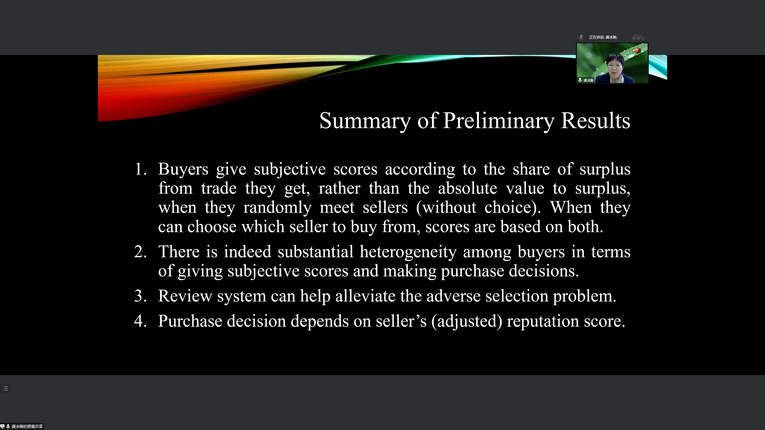 2022年10月10日14:30,山大行为实验经济公开分享荟2022年第8期(总第24期)在腾讯会议线上平台顺利召开,华东师范大学经济管理学部龚冰琳教授应邀做了题为“Can Adjusted Reputation Score Improve Market Efficiency? -Theory and Experiment”的主题报告。WilliamHill威廉希尔姜树广教授担任主持人,学院相关教师和博士、硕士研究生及校外同行共同聆听了此次报告。