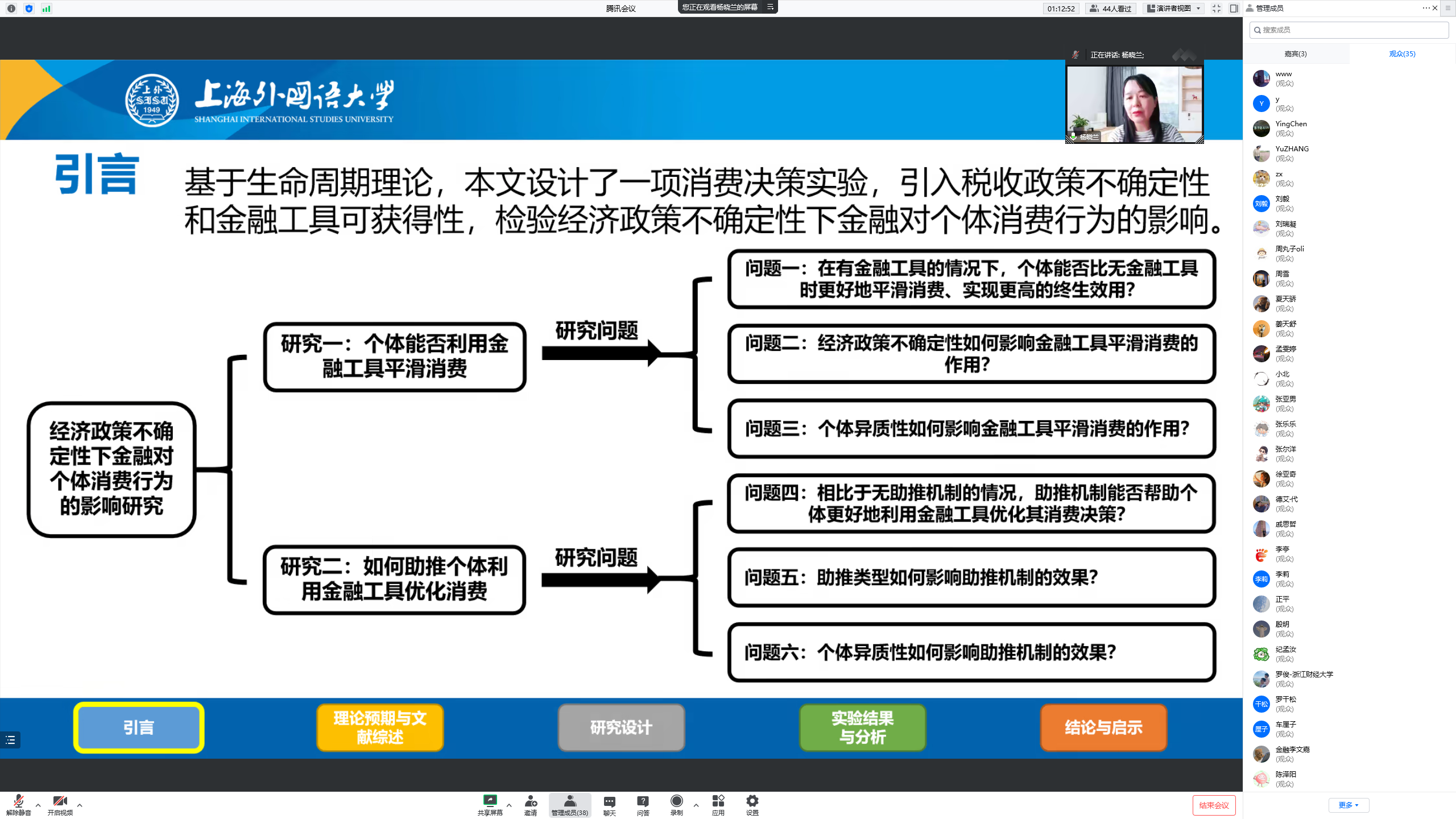 2022年11月9日14:30,山大行为实验经济公开分享荟2022年第9期在腾讯会议线上平台顺利进行,杨晓兰教授做客此次讲坛,讲述的主题为“个体能利用金融工具优化消费吗?——来自生命周期消费实验的证据”。此次讲坛由WilliamHill威廉希尔姜树广教授主持。WilliamHill威廉希尔相关教师和博士、硕士研究生及校外同行共同参加了此次学术论坛。