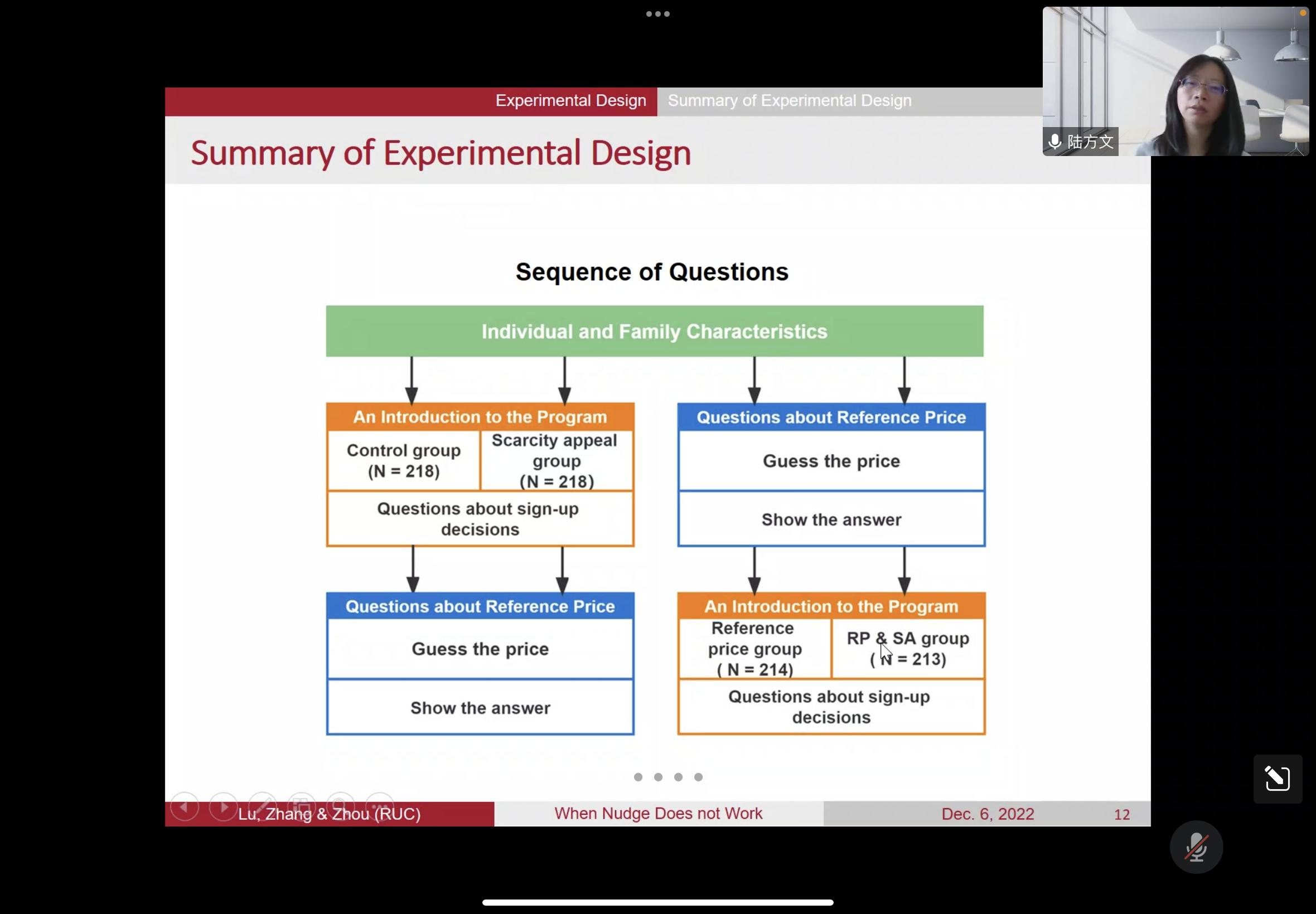 目前在教育上存在一个难题,成绩差的学生在上课时很吃力,却同时又不愿意接受教育援助。为了促进自愿性在线指导项目中被指导者的申请率,陆教授设计了两种助推策略—一种是强调该项目在市场上有很高的货币价值,另一种是强调先到先得的稀缺设置。参考价格的推动会产生异质效应——对认为自己无法获得学士学位的学生产生负面影响,对于其他学生则有正面影响或没有影响。进一步的证据表明,负面影响可能是由社会偏好驱动的——那些互惠倾向更强的人不太可能报名参加。与参考价格的推动相反,稀缺设置并没有产生显著的影响。