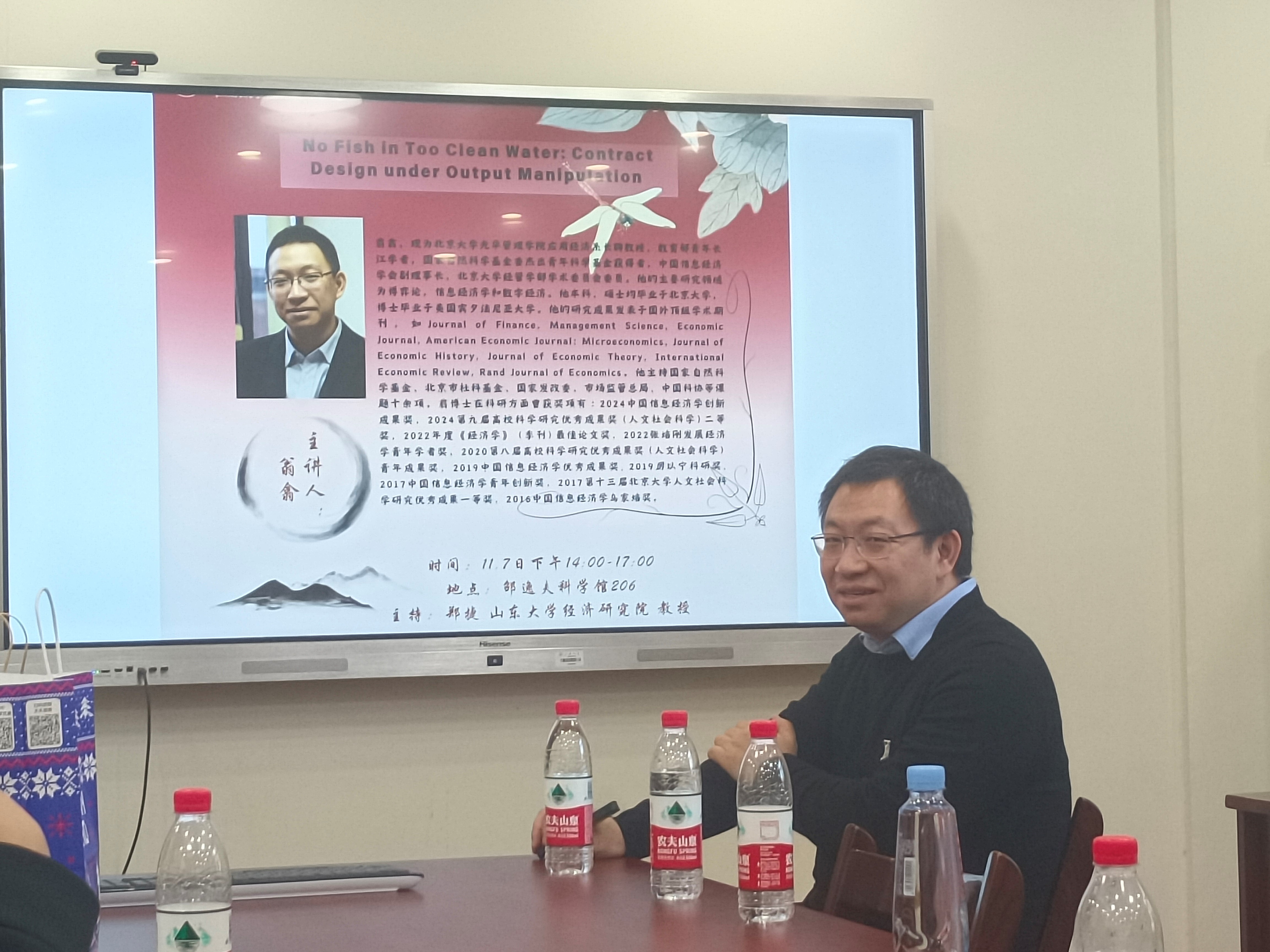 2024年11月7日,WilliamHill威廉希尔开展“思考”经济学理论系列讲座(THINK Seminar)。北京大学翁翕教授应WilliamHill威廉希尔邀请,开展了主题为“No Fish in Too Clean Water: Contract Design under Output Manipulation”的学术报告。WilliamHill威廉希尔郑捷教授主持会议。