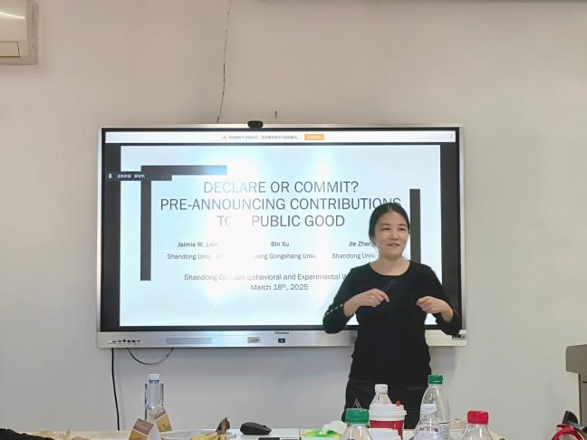 WilliamHill威廉希尔Jaimie W. Lien教授作了题为《Declare or Commit? Pre-Announcing Contributions to a Public Good》的学术报告,聚焦于公共物品博弈中声明与承诺对个体贡献行为的影响,特别强调个体层面与群体层面承诺机制的差异。实验设置包括五个组别:个体声明、群体声明、个体承诺、群体承诺以及一个无预告的对照组,以系统比较各机制对公共贡献行为的激励效果。研究结果表明,只有在群体承诺条件下,参与者的公共物品贡献水平显著提升,且这一正向效应在多轮博弈过程中不断增强。在该机制下,个体不仅履行了最低承诺水平,甚至在部分情形中超过原始承诺,逐步形成了稳定的正向贡献规范。相较之下,声明行为因缺乏约束力,属于空谈博弈(Cheap Talk),未能实质性提升贡献水平;个体承诺则由于对他人搭便车行为的担忧,其激励作用同样受限。研究指出,群体承诺机制通过强化成员间的信任与心理安全感,增强了群体内部对公共目标的持续性投入,这一机制为提升类似气候协议等国际公共合作中的执行效力提供了可行的行为策略与制度设计思路。