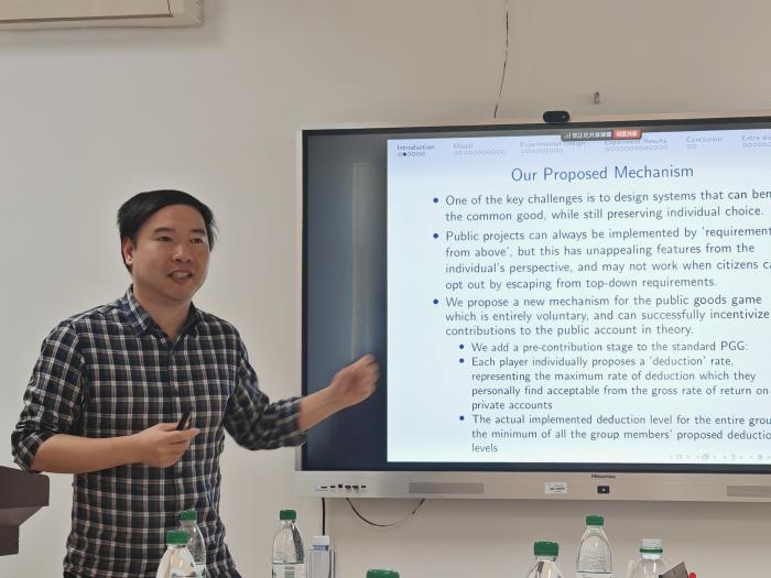 威廉中国官方郑捷教授作了题为《With Great Deduction Comes Great Cooperation》的学术报告。郑捷教授在报告中提出了一种新的公共物品博弈机制,旨在通过自愿降低私人账户回报率以激励公共物品的完全贡献。该机制包含两个阶段:第一阶段,参与者提出自愿扣除率,第二阶段,根据群体中的最低扣除率分配资源。为深入分析该机制的有效性,实验设置了两种学习环境:一是外生给定的扣除率范例(Game X),二是由参与者自主决定的内生扣除率(Game N)。实验结果显示,接受外生扣除率示范的参与者在随后的内生决策阶段表现出更高的公共贡献意愿和资源配置效率。研究表明,借助降低外部机会吸引力且无需强制干预的机制设计,结合范例引导的学习效应,能够有效协调个体决策与集体利益,为公共合作难题的解决提供了有益的理论支撑与实践启示。