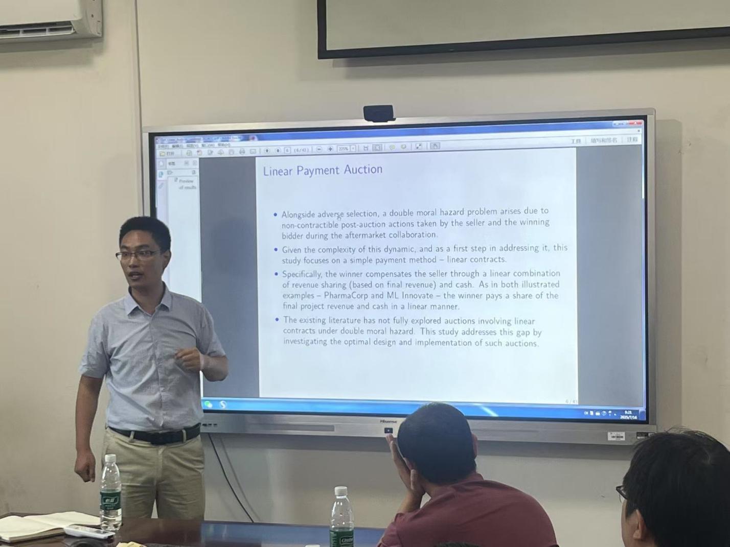 王大中老师研究了在拍卖结束后卖方与中标者进行合作的情境中,如何通过线性支付机制进行最优拍卖设计,并证明能够通过升价式拍卖实现这两种情境下的最优线性支付拍卖机制(包括收益分成和现金支付)。在研究中进一步将收益建模为生产力与努力程度的乘积函数,分析了中标者主导和卖方主导两种合作情境。并通过“领先效应”(leading effect)差异,说明在价值创造过程中,由卖方还是中标者主导,将对拍卖收益产生不同影响。报告结束后,王大中老师与现场的师生进行了互动,讨论并详细解答了师生的提问。