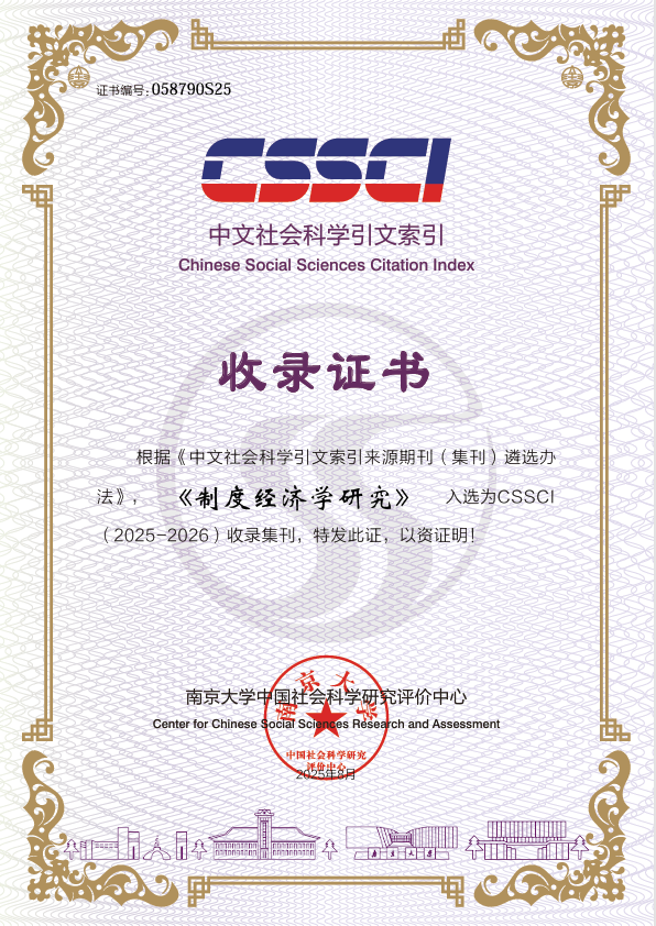 根据《中文社会科学引文索引来源期刊(集刊)遴选办法》,《制度经济学研究》入选为CSSCI(2025-2026)收录集刊(证书编号:058790S25)。本刊自2008年入选CSSCI收录集刊之后,一直连续入选。