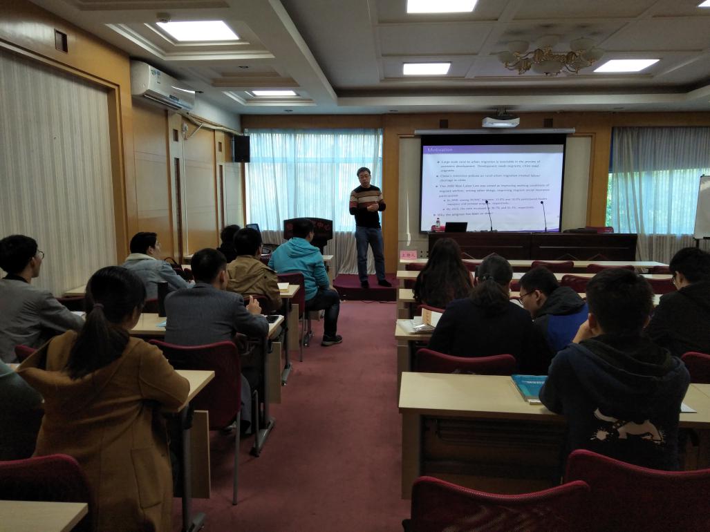 本次讲座以“信息可以影响中国农村移民的社会保险参与决策吗”为主题展开。赵国昌教授首先讲述了当前我国的社会保险制度的背景;接着,详细介绍了实验的具体过程及操作细节,为在场的同学们开拓了实验思路;最后,赵教授将实验得到的数据做回归分析,得出最终结论:社会保险在城市化进程中发挥着重要作用,对于医疗保险,缺乏信息是移民在非正规部门信息中参与度较低的重要原因之一,移民一旦获得信息,他们就可以从保险较低的城市迁移到保险较高的城市。在报告结束后,赵国昌教授耐心回答师生提出的问题,与在场师生进行了良好的互动。