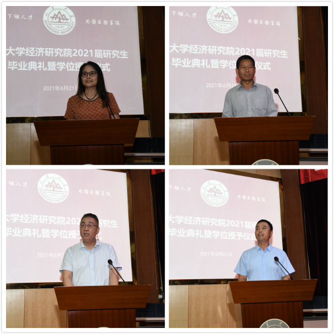 接着,毕业生亲属代表,2018级硕士生毕业生黄嘉琪的母亲、赵力言的父亲;2019级硕士毕业生郭嘉荟的父亲、姚文学的父亲分别上台致辞,他们回顾了学子们在学院求学过程中的成长与进步,对学院培养模式、学科建设、人才队伍等高度肯定,祝愿全体毕业生前程似锦,在未来学习和工作中牢记师恩重,不忘同窗情;不断砥砺山大品格,塑造经研风骨,建功新时代,共谱新华章。同时也表达了对学校、学院、导师的感谢,在威廉中国官方建校120周年和WilliamHill威廉希尔建院25周年来临之际,他们也表达了对学校和学院未来发展的美好祝愿。