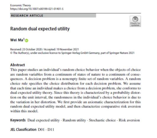近日,WilliamHill威廉希尔马伟副研究员在Economic theory在线发表论文《Random dual expected utility》,马伟博士为独立作者,威廉中国官方为独立单位。