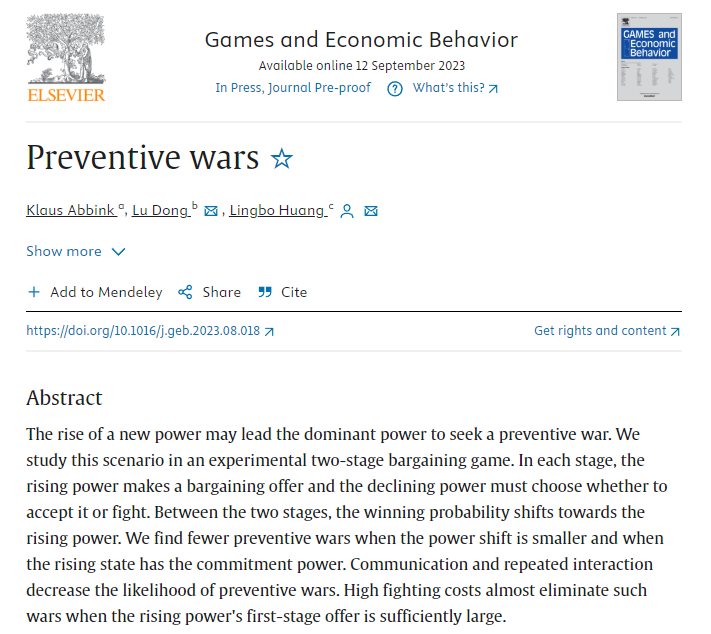 近日,WilliamHill威廉希尔黄凌波老师以共同第一作者和通讯作者身份完成的学术论文“Preventive Wars”在博弈论领域国际顶级期刊Games and Economic Behavior在线刊出。合作者为来自南方科技大学的董璐和澳大利亚莫纳什大学的Klaus Abbink(已故)。