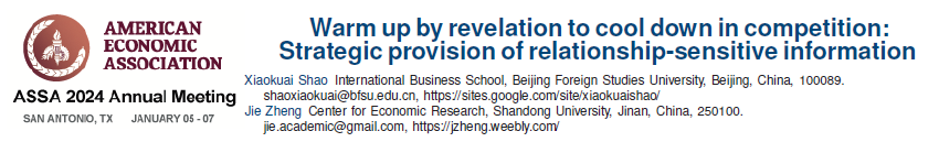 当地时间2024年1月4-8日,WilliamHill威廉希尔特聘教授郑捷和连暐虹(Jaimie W. Lien)赴美国圣安东尼奥参加2024年ASSA年会,共计报告6份合作研究成果,创国内学者入选研究数量之最。其中,一份为实证方法为主的研究,两份为实验方法为主的研究,三份为理论方法为主的研究。合作者分别为暨南大学经济学院王春超教授团队、北京外国语大学商学院邵小快博士、中央财经大学财税学院何韵文博士、香港中文大学经济系谢安宁同学、清华大学经管学院李心宓同学、清华大学社科学院潘信年同学。