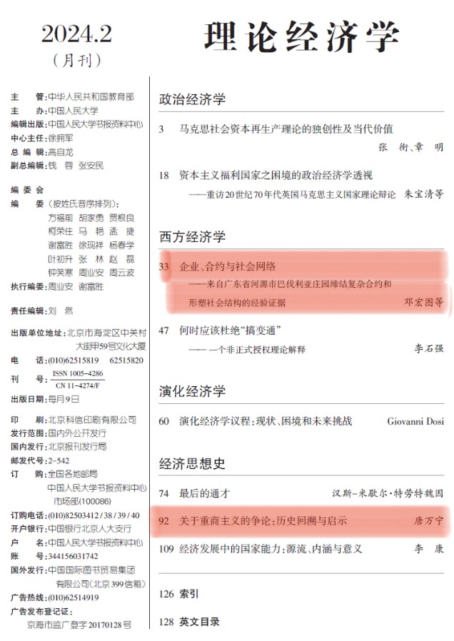 《制度经济学研究》2023年第2期(总第80辑)的两篇文章被人大复印报刊资料《理论经济学》2024年第2期同时转载。两篇文章分别是:邓宏图、徐玲俐、赵燕、邓格致的《企业、合约与社会网络——来自广东省河源市巴伐利亚庄园缔结复杂合约和形塑社会结构的经验证据》和唐万宁的《关于重商主义的争论:历史回溯与启示》。