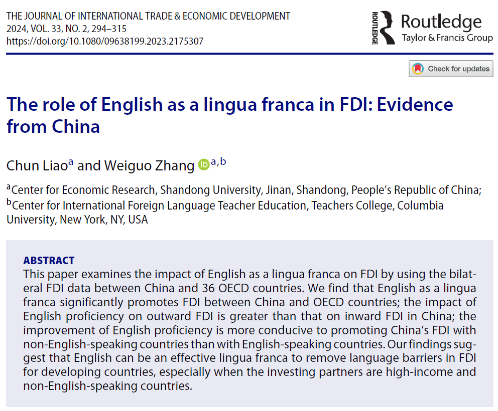 发表在《Journal of International Trade & Economic Development》(2024,Vol. 33;SSCI收录,JIF2.2,JCR Q2区)的论文——《The Role of English as a Lingua Franca in FDI: Evidence from China》,利用1997-2019年中国和 36 个经合组织(OECD)国家间的双边数据,研究了英语作为通用语言对外商直接投资的影响。研究发现,英语作为通用语言极大地促进了中国与经合组织国家之间的外商直接投资。此外,英语水平对中国外向投资的影响大于对内向投资的影响。与英语国家相比,提高国民英语水平更有利于促进中国与非英语国家的外商直接投资。上述结果表明,作为一种国际通用语言,英语可以有效地克服发展中国家在对外直接投资中的语言障碍,特别是当投资伙伴是高收入国家和非英语国家的时候。论文的贡献在于,揭示了国家语言能力在对外贸易和直接投资中的重要作用,为语言与投资研究提供了中国的经验证据。