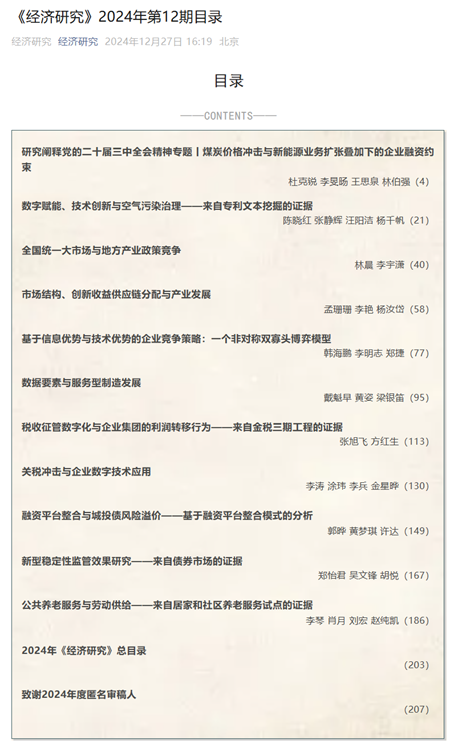 近日,我院郑捷教授与清华大学经济管理学院的李明志副教授和博士生韩海鹏同学合作的成果“基于信息优势与技术优势的企业竞争策略:一个非对称双寡头博弈模型”发表于《经济研究》2024年第12期,这是郑捷教授团队在数字经济与行为科学领域的又一重要研究成果,也是郑捷教授2024年发表的第四份A类成果(之前的两份英文工作分别于7月和11月发表于博弈论顶刊Games and Economic Behavior,另一份中文工作于2月发表于《经济研究》)。《经济研究》是中国经济学领域的顶级期刊,代表了中国经济学研究的最高水平,1955年创刊,由中国社会科学院主管、中国社会科学院经济研究所主办。