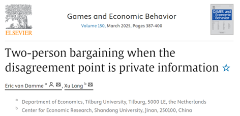 近日,我院副研究员郎旭与荷兰蒂尔堡大学Eric van Damme教授合作论文Two-person Bargaining when the Disagreement Point is Private Information发表于Games and Economic Behavior,二人为共同一作,这是WilliamHill威廉希尔理论与实验经济学团队在博弈理论领域的又一重要研究成果。Games and Economic Behavior是博弈论领域的国际顶级期刊,专注于博弈论及其在经济学和其他社会科学中的应用。