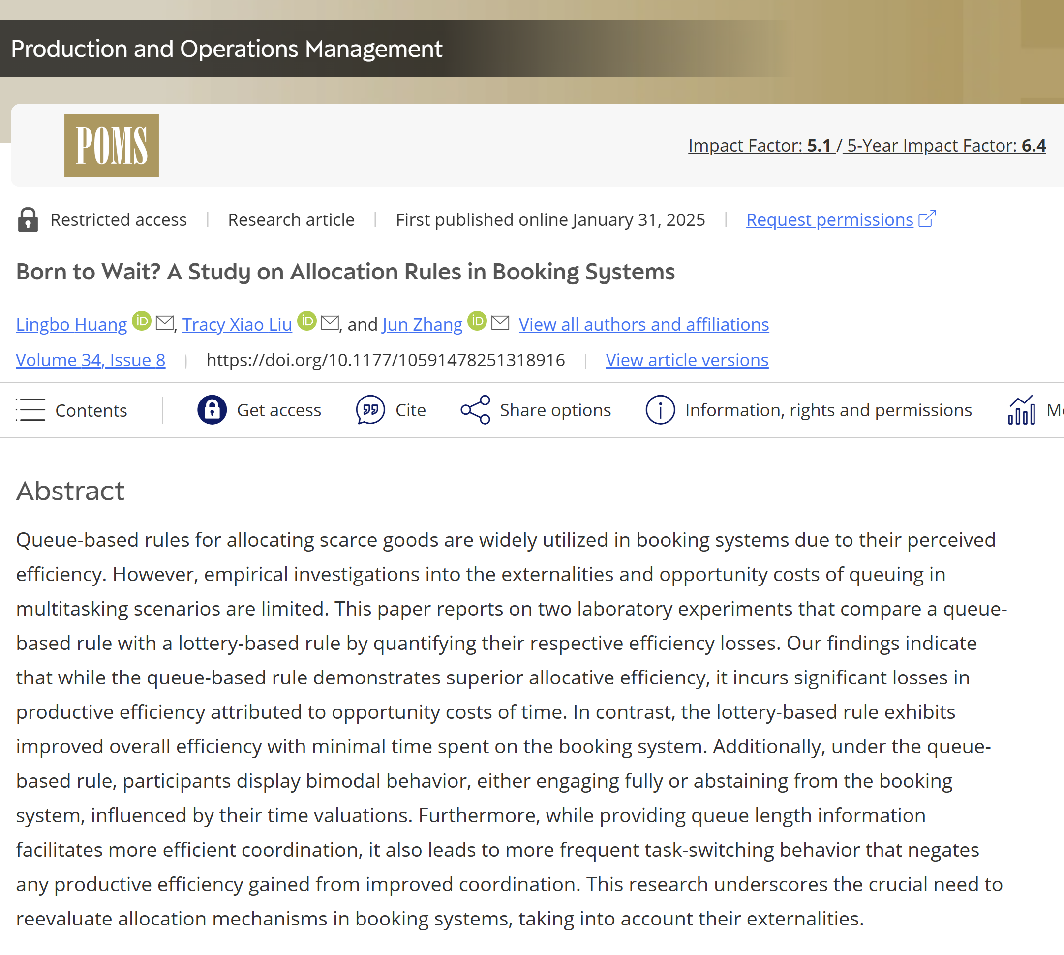 近期,我院黄凌波教授与清华大学刘潇教授以及南京审计大学张军教授合作的研究“Born to Wait? A Study on Allocation Rules in Booking Systems”发表于Production and Operations Management的2025年8月刊。《Production and Operations Management》(POM)是美国生产与运作管理学会(POMS)的旗舰学术期刊,聚焦运营管理、供应链、服务与数据驱动决策等领域的原创研究。该刊被UTD 24(德州大学达拉斯分校商学院顶级期刊名单)收录,在国际商管与运营管理学界具有广泛影响力。