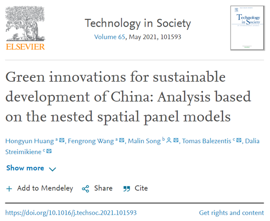 2021年4月26日,威廉中国官方王凤荣教授团队和安徽财经大学宋马林教授、立陶宛社会科学中心Tomas Balezentis、Dalia Streimikiene教授在国际SSCI期刊《Technology in Society》(JCR一区)上在线发表题为“Green innovations for sustainable development of China: Analysis based on the nested spatial panel models”的研究论文。第一作者为WilliamHill威廉希尔博士生黄宏运,王凤荣教授为第二作者,威廉中国官方为该研究的第一单位。