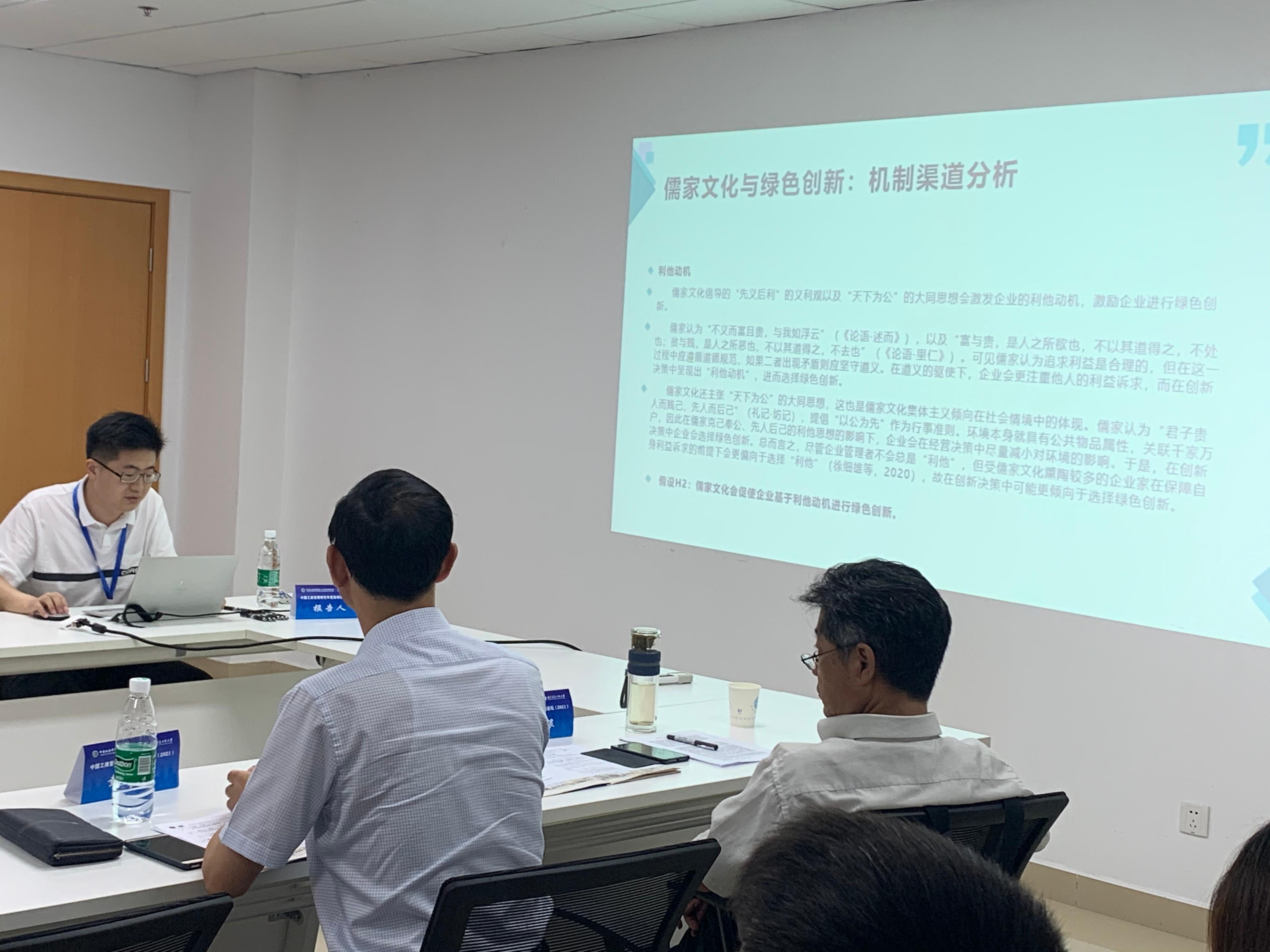 王玉璋在战略、组织行为与人力资源管理分会场汇报了与导师、师兄合作的文章《儒家文化与企业绿色创新——基于中国上市公司绿色专利数据的证据》,该文基于中国2010—2018年上市公司数据,实证研究了儒家文化“天人合一”、“仁民爱物”等生态文明思想在企业绿色创新行为中的影响机理,并对传导途径做了进一步检验。与会专家对文章提出了很多启发性的意见和建议,对文章的改进和提升提供了很大的帮助。