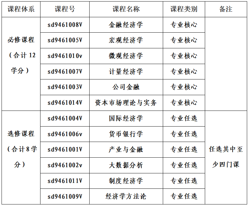 聚焦于资本市场与资产管理人才核心能力与培养目标,开设20个学分课程,具体课程如下:必修课为金融经济学、宏观经济学、微观经济学、计量经济学、公司金融、资本市场理论与实务等六门,选修课为国际经济学、货币银行学、产业与金融、大数据分析、制度经济学、经济学方法论等六门,任选其中至少四门课,每门课程2学分,32课时。详见下表。