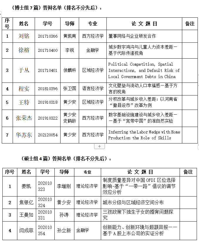 为了鼓励研究生创造性学习,锻炼和提高研究生的科研能力、思维能力和学习能力,我院每年开展一次研究生经济学学术论文比赛征文。今年于2021年3月开始征文,共收到参赛论文50篇,经过初选及老师评议,共有11篇论文入围论文答辩会。现定于2021年11月13日(周六)下午2:00,在知新楼C座201教室进行答辩。请各位入围者准备好15分钟的答辩PPT以及20份纸质版答辩论文,按照以下博士组、硕士组的分组顺序依次答辩。
