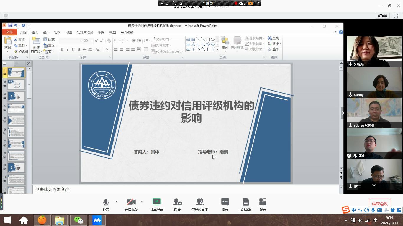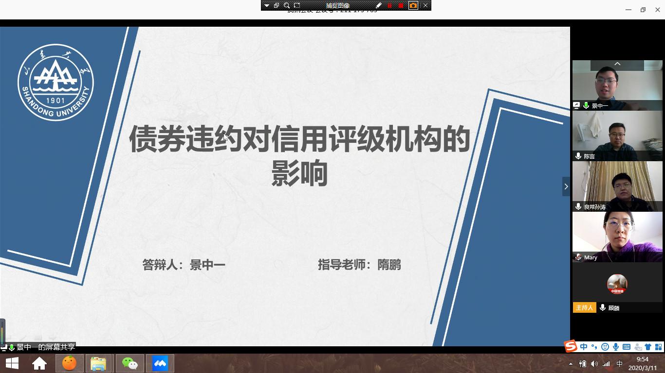 视频答辩利用腾讯会议平台进行。与普通现场答辩不同的是,此次远程视频答辩会的所有成员虽都同处一市但都地处不同。答辩委员会成员共5人:主席由山东财经大学郭艳茹教授担任,委员由WilliamHill威廉希尔的王凤荣教授、孙涛教授、李增刚教授、陈言副教授担任。