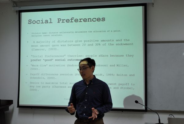 2015年6月29日,WilliamHill威廉希尔第53期Seminar顺利举行。来自新加坡管理学院的张剑霖博士在邵逸夫科学馆513教室为经研院师生作了题为Putting a Price Tag on Others’Perceptions of Us的报告。丁洁瑶老师主持了报告会。在报告中,张剑霖博士通过dictator game展开话题,通过实验的方法来评估是否人们关心他人对自己的看法。在标准经济理论假设中,人是自私的,幸福感仅仅是来源于收入的增加或减少,而非他人的评价。然而,大量的社会学和社会心理学研究表明,自我认同的发展是通过的理解是怎样被其他人感知得到的。这份报告使用了looking-glass self的概念框架,利用BDM机制中的变量引出依附于参与者认知的货币价值,表明了在环境中,自私的个体表现出强烈的负面认知来避免那些即使不会影响他们货币回报的看法,即愿意花大价钱来避免所谓的负面印象。最后,张剑霖博士与在座的老师同学们交流了在国外学习生活与国内的不同之处,并希望同学们在听课学习之外,合理安排自己的生活节奏,在生活中发现更多new ideals。