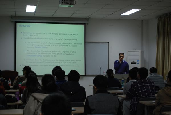 主持老师首先为同学们介绍了主题背景并热情地欢迎汪意成老师的到来。随后,汪意成老师为大家分别讲解了两个模型,分别研究讨论了创新和不完备市场,以及债务市场、人力资本投资及其宏观含义等主题。通过这两场讲座,使学生了解了经济前沿,并学习了相关理论和研究方法,为学生今后的研究提供了新思路和新方法。最后是与台下师生的讨论阶段,大家积极踊跃地提问,汪意成老师对问题进行一一讲解并与大家就提出问题展开深入探讨。