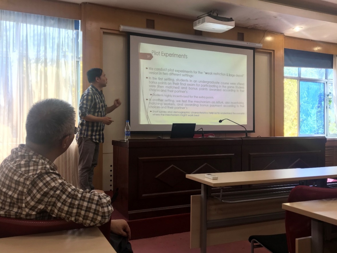上午,郑捷副教授报告了关于《Self-Commitment for Cooperation》的研究。在报告中,郑捷副教授分析了囚徒困境中自我承诺与合作的关系,提出在囚徒困境中维持合作的新机制——通过自我承诺促进合作,然后详细介绍了如何利用实验验证理论模型的有效性。研究者在两种不同设置下对“weak restriction & large deposit”进行了预实验,第一种情况下,通过计算机对参与博弈实验的学生进行配对,根据他们与合作伙伴的选择在期末考试中给予奖励加分;在另一种情况下,研究者会在在线任务平台MTurk上测试该机制,同时也会匹配参与者,并根据他们与合作伙伴的选择来发放奖金。主要实验依然为传统的实验室实验(10轮,随机匹配),实验设置了1个控制组,4个实验组。研究结果表明,自我承诺机制成功地将合作偏好者从背叛者中分离出来。还发现,当受试者不熟悉这种机制时,学习是非常重要的。这篇研究提出了一个简单但很好的设计来促进囚徒困境情景下的合作,实验结果也提供了积极的证据支持他们提出的机制。