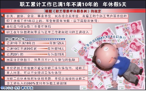 图表:职工累计工作已满1年不满10年的 年休假5天 新华社发